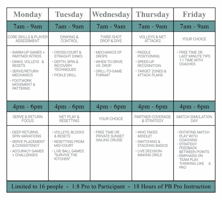 Each retreat is custom tailored to elevate your game and specific goals while letting you soak in Costa Rica’s beauty. Enjoy two daily clinics led by professional pickleball coaches, blending skill development, strategy, and match play. Between sessions, unwind by the ocean, explore local adventures, or take advantage of our optional wellness upgrades. With a 1:8 pro-to-player ratio, personalized attention ensures every player grows — on and off the court.